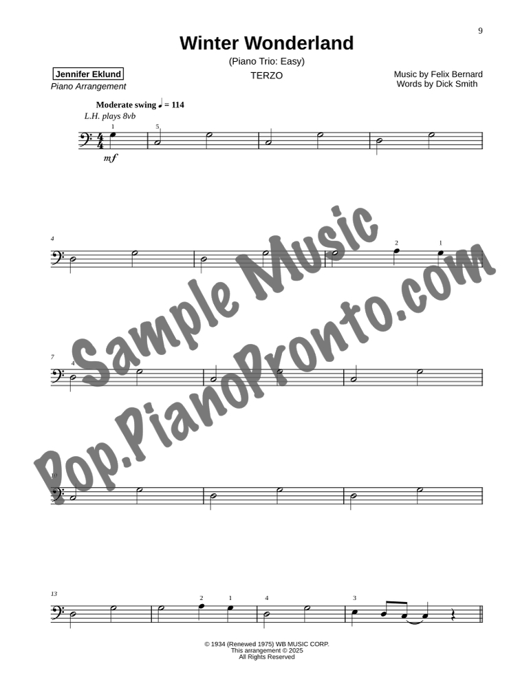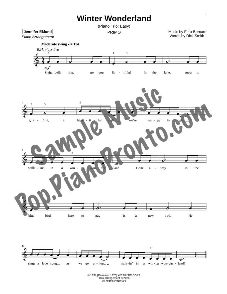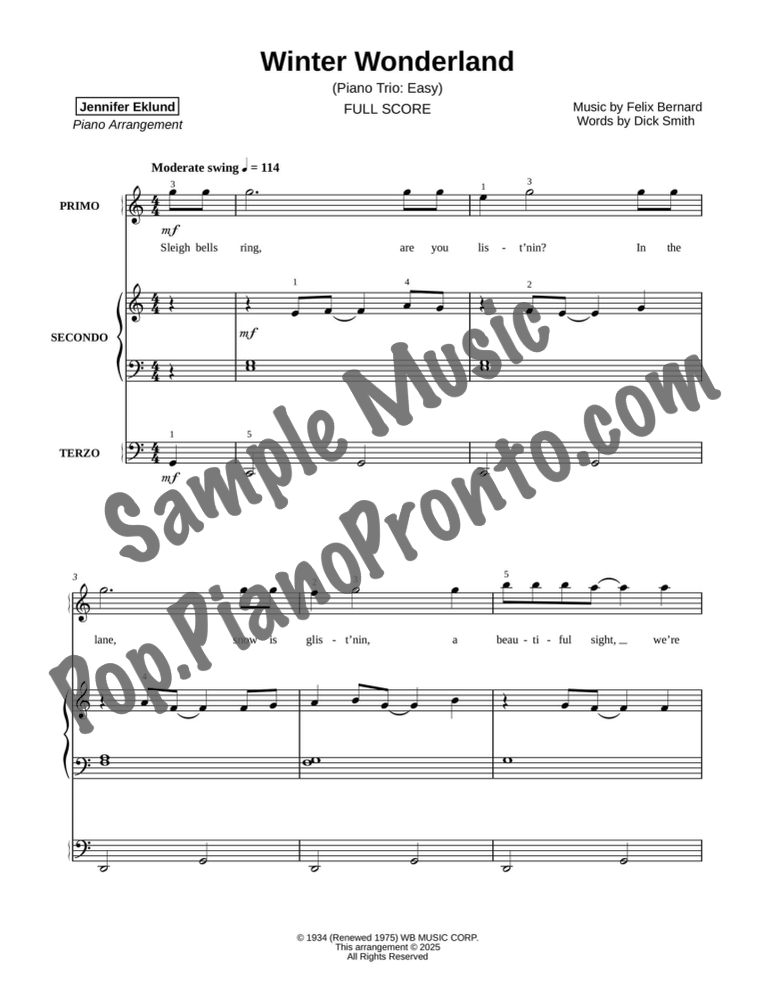 Winter Wonderland, a joyful holiday favorite, stylishly arranged as an easy trio for late beginners and early intermediates by Jennifer Eklund. This ensemble piece serves as a great introduction to easy collaborative playing and will also be effective in group piano settings with multiple keyboards. Purchase includes separated parts and a full conductors score.