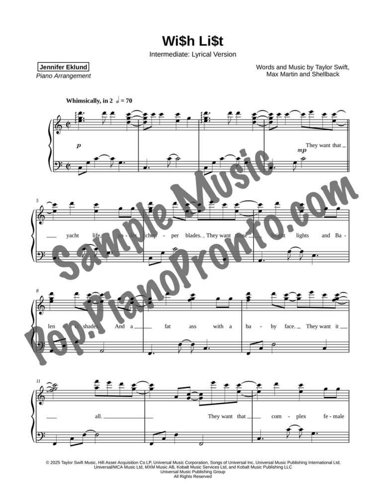 Wish List (Wi$h Li$t), as performed by Taylor Swift from album "The Life of a Showgirl" set here as a sparkling lyrical piano solo for intermediates by Jennifer Eklund. This version has the vocal range set higher.