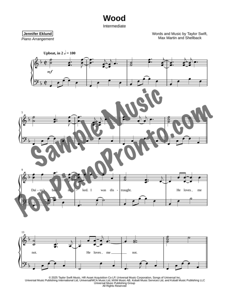 Wood, as performed by Taylor Swift from album "The Life of a Showgirl" stylishly arranged for intermediate piano by Jennifer Eklund.