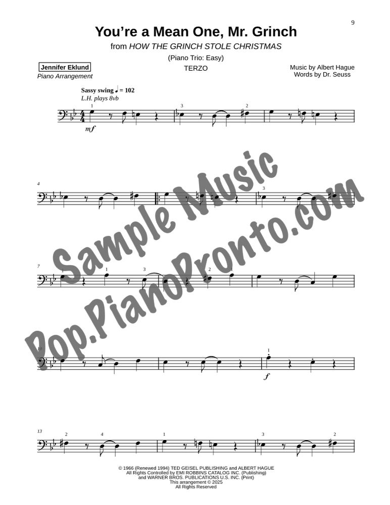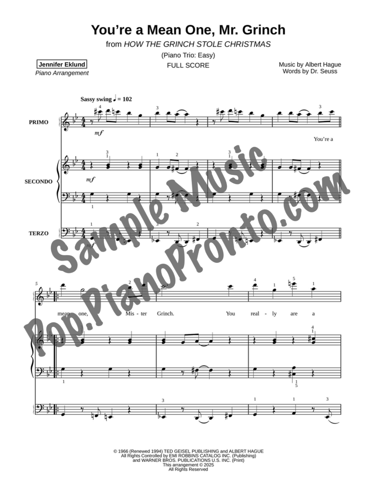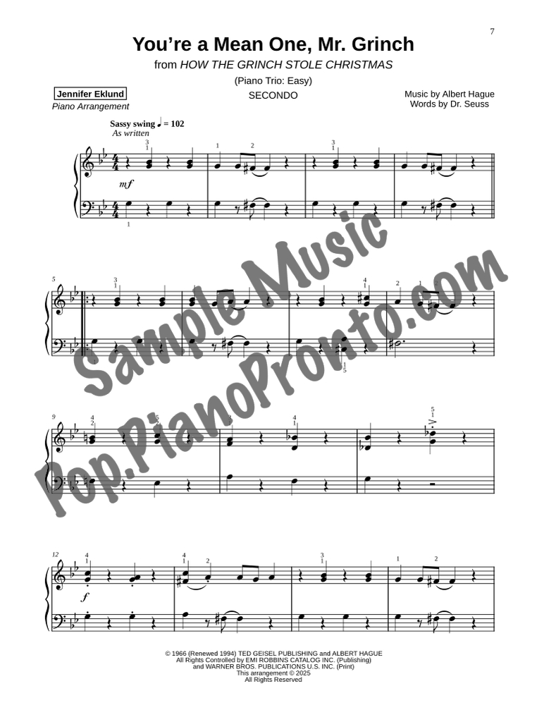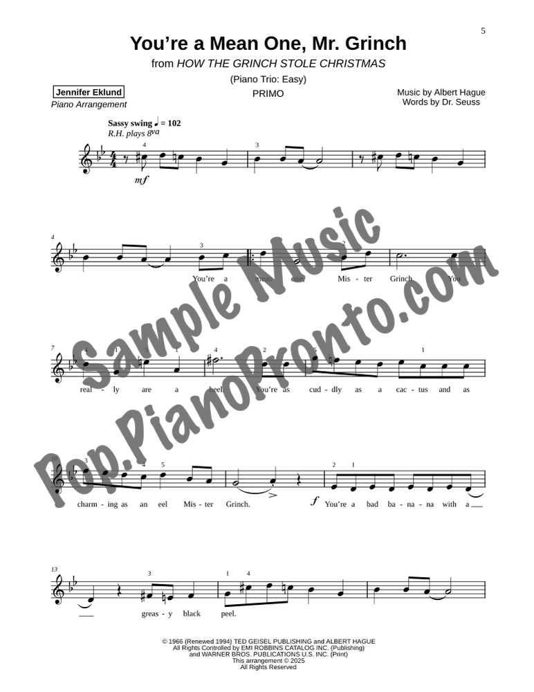 You're a Mean One, Mr. Grinch, a sassy swinging holiday classic, stylishly arranged as an easy trio for late beginners and early intermediates by Jennifer Eklund. This ensemble piece serves as a great introduction to easy collaborative playing and will also be effective in group piano settings with multiple keyboards. Purchase includes separated parts and a full conductors score.